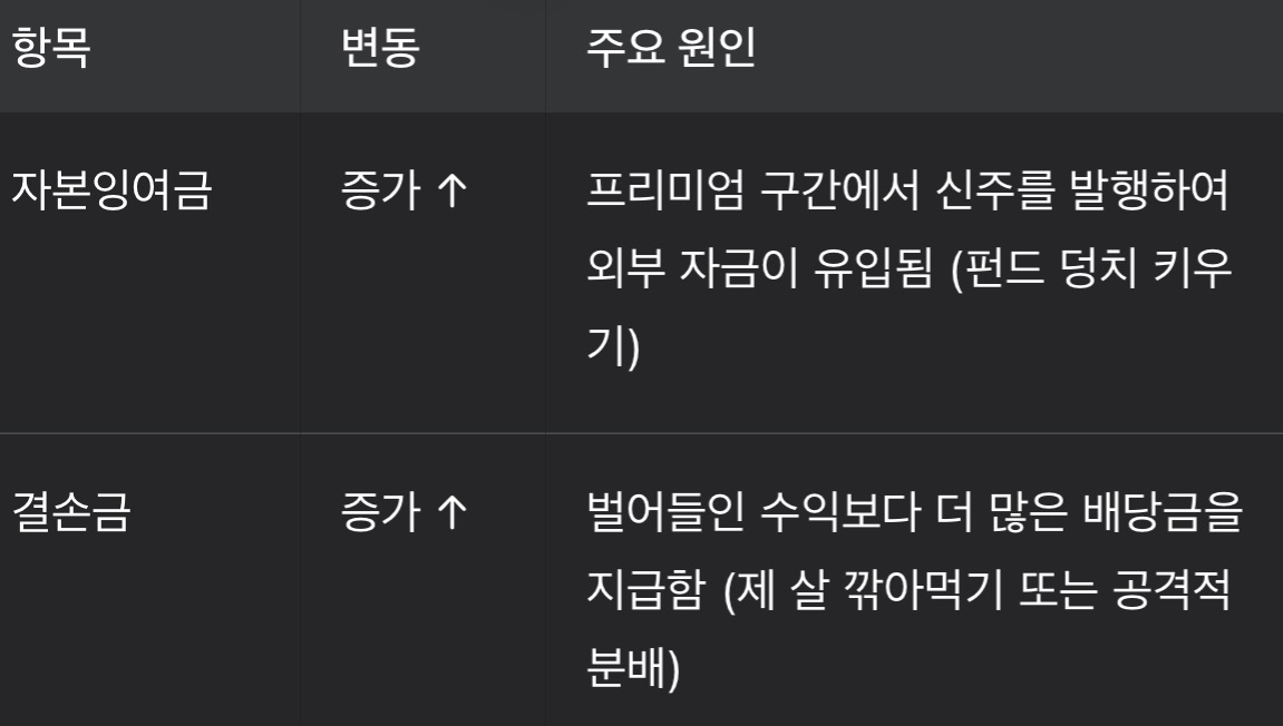 이 상황을 한 줄로 요약하면 "한쪽에서는 새 투자자에게 돈을 받아 자본을 채우고(자본잉여금 증가), 다른 쪽에서는 기존 투자자에게 이익보다 많은 배당을 줘서 장부상 손실을 기록하고 있는 것(결손금 증가)"