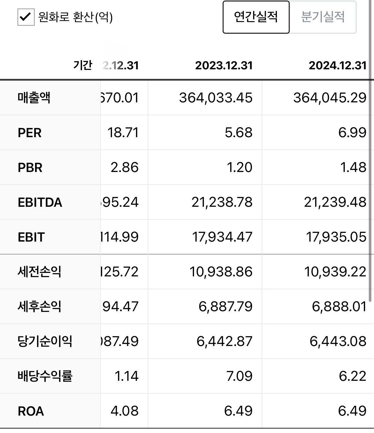 | 연도 | 연간 배당금(주당) | BVPS(주당) | 영업이익률(EBITDA %) |