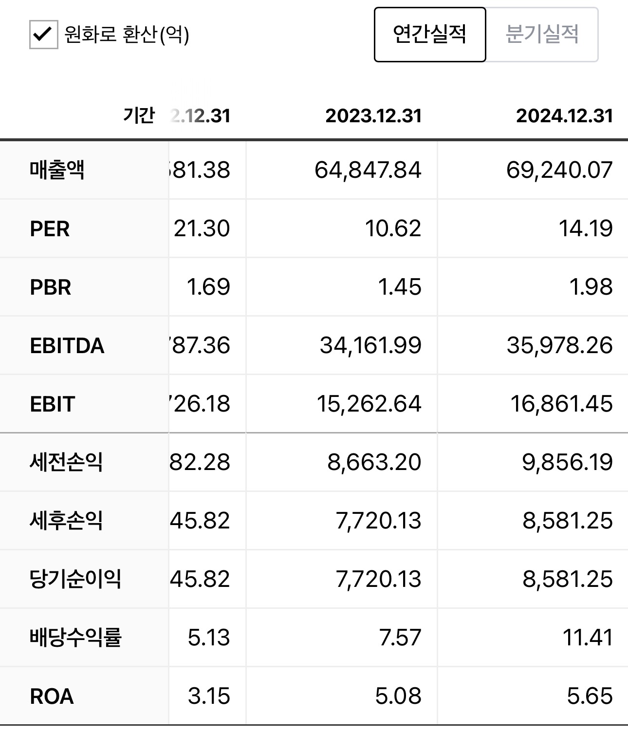 | 연도 | 연간 배당금(주당) | ARPU(인당 평균 매출) | ROE(자기자본이익률) |