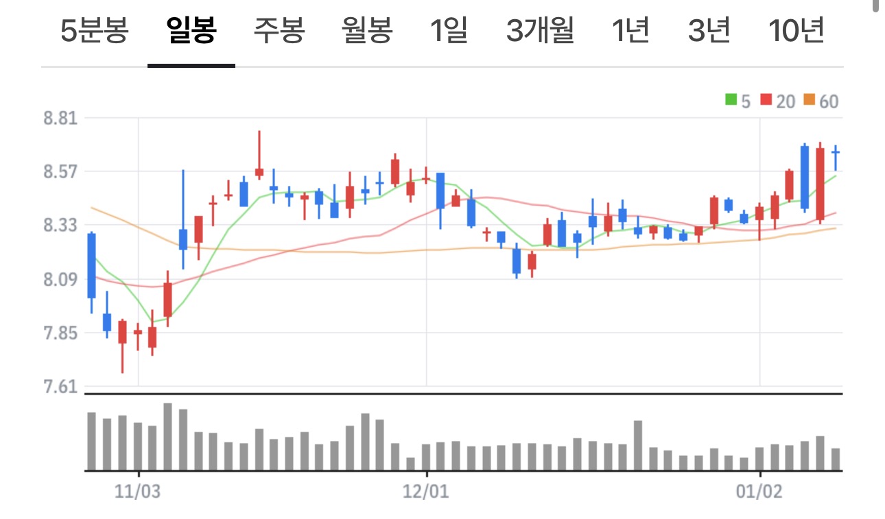 - Dividend Yield (시가 배당률): 현재 주가($8.6~8.7) 기준 약 6% 내외임.