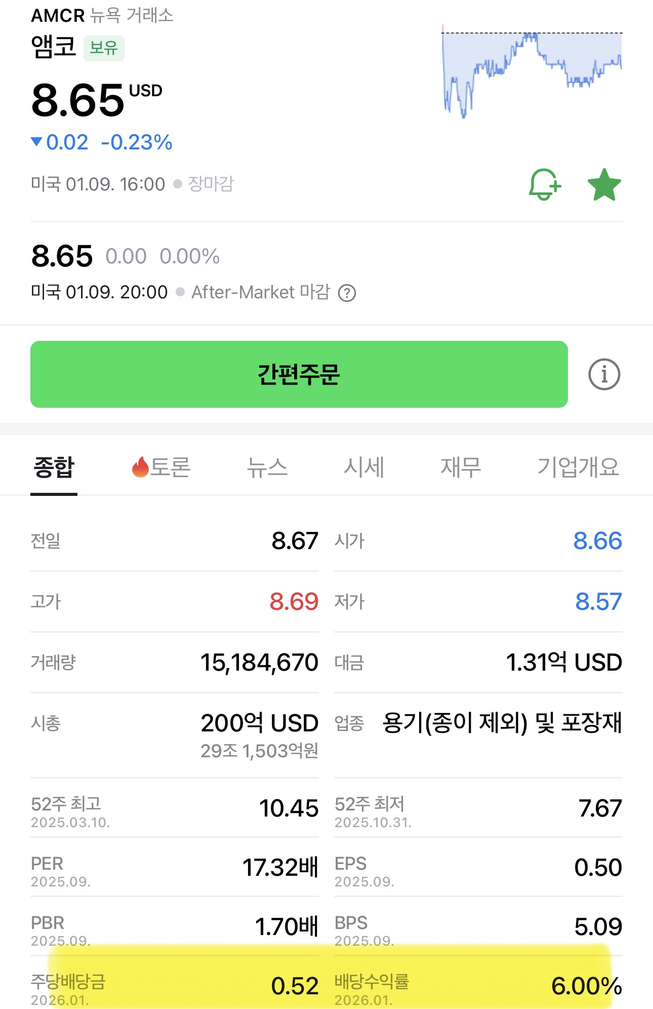 AMCR이 '안전한 고배당'을 찾는 투자자에게 현시점 가장 매력적인 선택지 중 하나라는 것임. 주식 병합(Reverse Split)으로 인한 단기적 변동성은 있겠지만, 베리 글로벌과의 통합 이후 현금 흐름이 2배 가까이 점프한 점에 주목해야 함. 2026년 현재 인플레이션 둔화로 원자재 부담이 줄어들고 있고, 필수 소비재 포장이라는 사업 특성상 경기 침체가 와도 배당금이 흔들릴 가능성은 희박함. '배당 수익률 6% + 합병 시너지를 통한 EPS 성장'이라는 두 마리 토끼를 잡을 수 있는 구간으로 판단함.