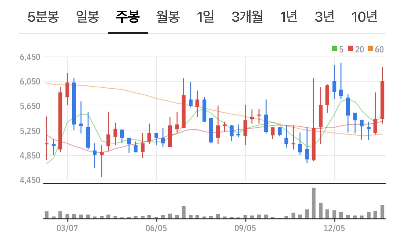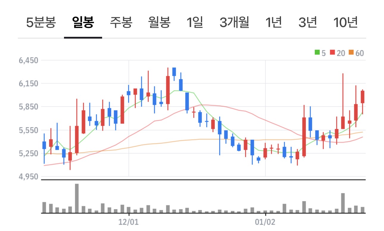 - 현재 주가 상태: 52주 최고가(6,350원) 대비 약간 조정받은 상태이나, 장기적인 바닥권에서 반등을 시도 중임.