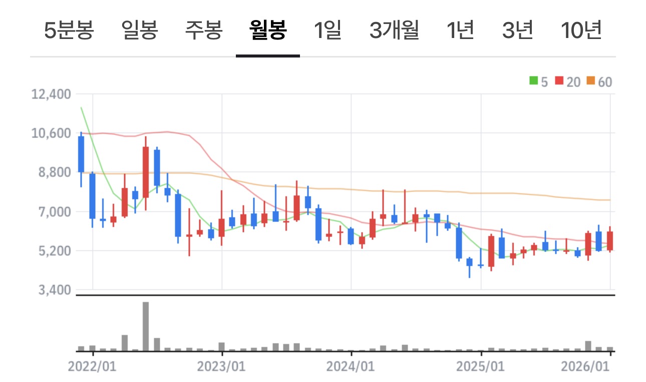 현재 주가는 5,000원~6,000원 박스권에서 움직이는 모습임.