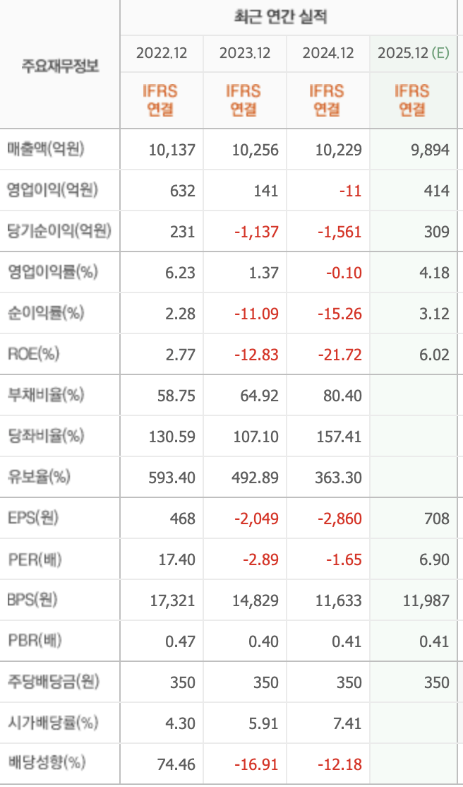 - PBR(주가순자산비율): 약 0.4배. 주가가 자산 가치 대비 저평가되어 있음. 이는 시장이 본업의 성장성을 낮게 평가한다는 의미