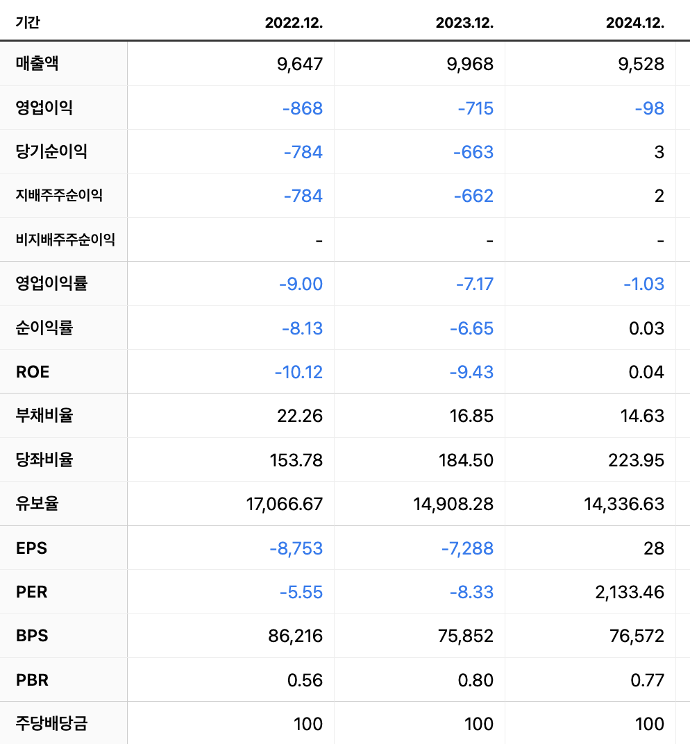 - 2023년: 매출은 약 9,968억 원으로 살짝 반등했으나, 영업손실 715억 원으로 수익성 최악 찍음.